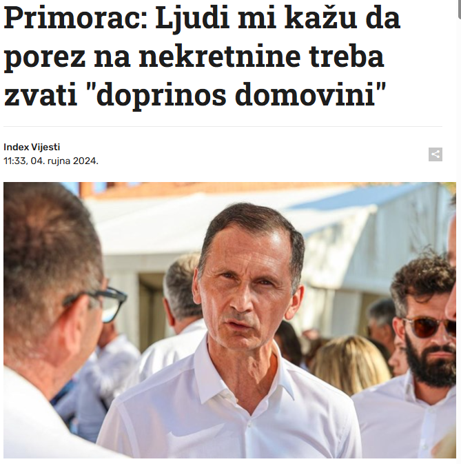 I onda, vratimo se na početak. Predsjednički kandidat HDZ-a danas je izjavio da mu ljudi kažu da se porez na nekretnine treba zvati doprinos domovini. Koji ljudi, ne govori, ali ja mislim da se radi o Marku Miliću, Andreju Plenkoviću i onom Butkoviću. Domovini sam doprinio, i to jako godine 1991. s Thompsonom u rukama. Domovini je istovremeno doprinosio i Primorac na bojištu negdje u Americi. Domovini sam doprinosio svojim ogromnim doprinosima kroz cijeli radni staž. Kroz PDV. Kroz poreze za sve i svašta. Kroz pristojbe za korištenje morskog dobra, a čamac mi desetljeće na suhom vezu, jer mi lokalna mafija ne da vez ako ne dam novce. Domovini doprinosim svaki dan, plaćajući preskupo gorivo, preveliki PDV. E pa kuću vam ne dam, lopovi!