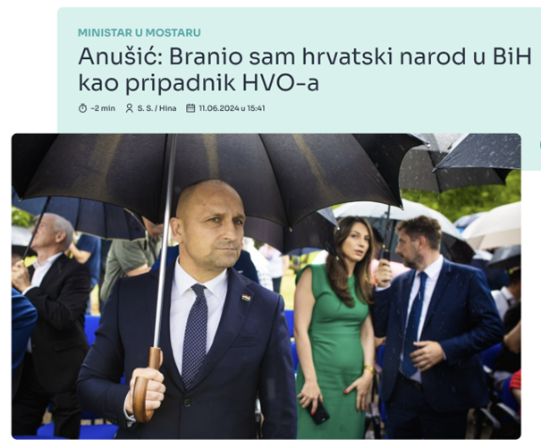 Ondak smo saznali da nam ministar od vojske i nje baš nešto školovan, jerbo je napustijo školu i otišao braniti domovinu. Sve je to izjavio sam i nabijo na nos Kršitelju Ustava, pri tome zaboraviši da ni Laki nije bio ni dana u vojsci. Niti onoj JNA, a još manje u HV. Jerbo ga je jebala anemija, potvrđeno potpisom majke vojne lekarke. Ili neškolovani, ali ljukavi Slavonac i nije baš zaboravio da mu ni šefonja nije vidio vojske, pa je jednim udarcem išao ubiti dvije muve. Koje oko njega jute gliserima i helikopterima. Rečeni manjkavo školovani ministar javno se hvalio da je bio borac HVO riječima Branio sam hrvatski narod u BiH kao pripadnik HVO-a, izrečenim u Mostaru 11.06.2024.