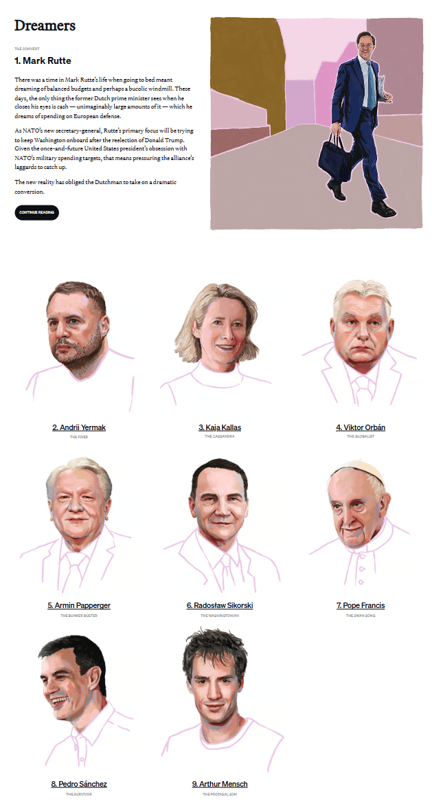 Mark Rutte, Andrej Jermak, Kaja Kallas, Viktor Orban, Armin Papperger, Radoslav Sikorski, Papa Franjo, Pedro Sanchez, Arthur Mensch.