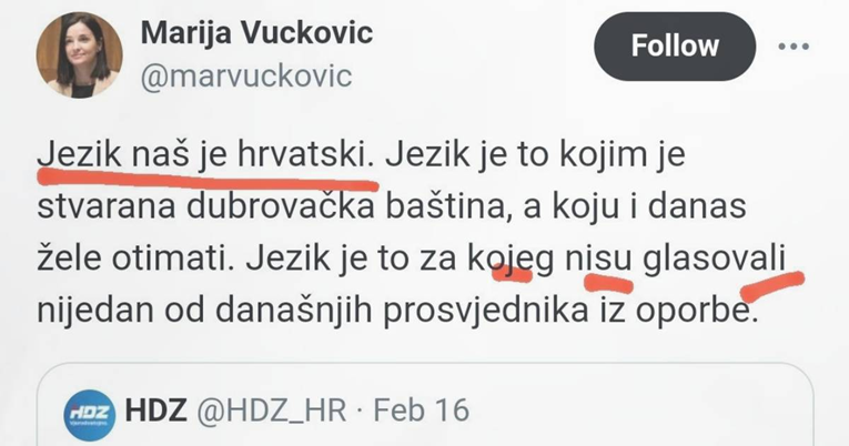 Javila se i Marija Vučković, nepismeno sklepanom objavom na Twitteru, što me navodi na pomisao da je i ona kupila diplomu, barem srednje škole u rodnom Mostaru, Jer greške koje radi ne rade ni srednjoškolci. I ona je napala prosvjednike jer nisu glasali za jezik. Napisala je hrvatski, ali sumnjam, ona ga ne poznaje. Što je vidljivo iz kasnije korekcije tvita kojeg je objavila. U njenoj objavi nema niti riječi o poticajima višemilijunskim, koje daje drugim svojim stranačkim harambašama. Ne spominju se ni braća Pivac. Ali, jebi ga i ona je našla nešto napisati. Pa kad je vidla što je objavila, onda je twit lijepo pobrisala. Pametno i oštroumno.