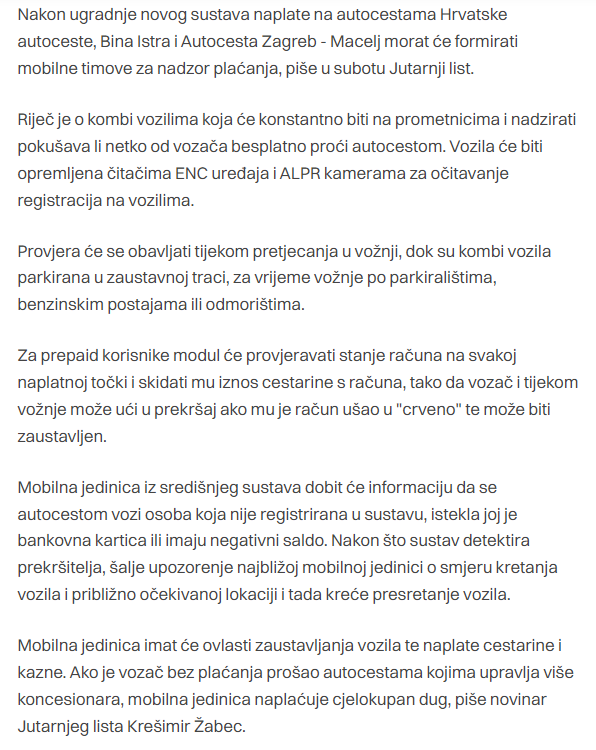 I onda, nakon dvadesetak godina rasprave, treba li biti sustav ENC, ili plaćati se nekakav paušalni iznos ili prema prijeđenim kilometrima, Vlada, odnosno HAC, koji je u državnim rukama se genijalno dosjetila i povjerila posao firmi iz Slovačke. Slovačka, promet, autoputovi… Na pamet mi pada dvadesetak država koje su razvijenije, koje imaju bolje organiziran promet, a Slovačka nije među njima. Valjda ovi u Vladi znaju.