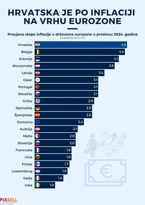 Prema prvoj procjeni koju je objavio Eurostat, godišnja stopa inflacije u prosincu mjerena harmoniziranim indeksom potrošačkih cijena (HICP) u Hrvatskoj je iznosila 4,5 posto, najviše od svih zemalja članica eurozone. U cijeloj eurozoni prosječna godišnja stopa inflacije u prosincu iznosila je 2,4 posto. Bolji smo od te eurozone dva puta. To vam otprilike znači ovo. Kod nas je kava poskupila dvije lipe. A u eurozoni jednu lipu. Pa ljudi moji, jel to tragedija? Naravno da nije. Taj podatak o cijeni kave iznio je glavom i bradom naš premijer, Andrej Plenković, ajde da vidim, tko njemu ne vjeruje.