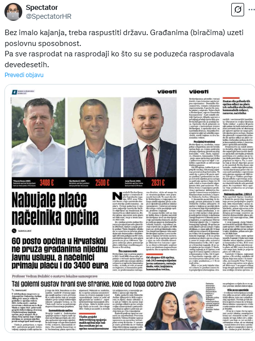 Stvorena je država po mjeri njenih stanovnika. Nisu to građani, prije bi se moglo reći, malograđani. Državom upravljaju neuki ljudi, kasta povlaštenih, kao u vrijeme Franje Tahija. Lokalni šerifi upravljaju općinama u kojima nema života. Nema posla, nema budućnosti. Ali ima općinskih uprava. Na selima ljudi životare i pokušavaju će snaći s nekoliko stotina EUR-a mirovina ili primanja, a suvremeni Tahiji se guše u plaćama od tri tisuće EUR-a. kad bismo se upitali, a zašto, suvislog odgovora ne bismo imali. Imamo samo slutnju o kupovini lojalnosti lokalnih čelnika državnoj vlasti. Mjesto s manje od dvije tisuće stanovnika, razasutih po brojnim zaselcima, ima načelnika, ima donačelnika, ima fakturni odjel, mali do bratića je komunalni redar, žena od ulizice je šefica pravne službe. I oni funkcioniraju. Njih desetak dobije oko petnaestak tisuća EUR- neto kao plaću. Ne zarade. Dobiju. Od mještana koji nemaju ni par stotina EUR mjesečno. Mužače odjevene u skupe haljine, koje nabadaju u štiklama ko što koze nabadaju, za nerad dobivaju dvije tisuća EUR. Nitko od njih ne može na pola stranice formata A4 napisati što je radio ovaj mjesec. Napisati velikim slovima.